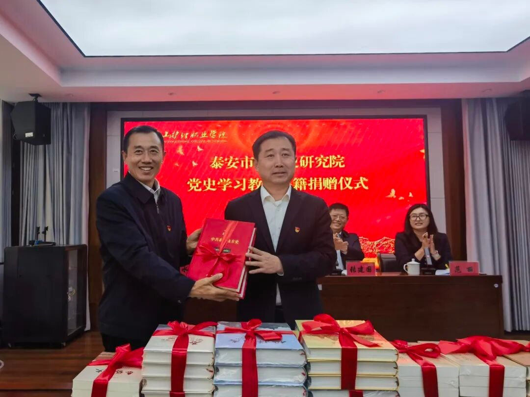 泰安市委党史研究院四级调研员李海卫代表研究院向学院机关党委捐赠地方党史学习书籍,党委委员、纪委书记杨培水代表学院接受赠书。